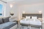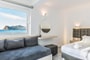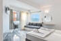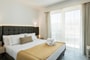 This spacious apartment features two luxurious, separate bedrooms and a comfortable living room with a sofa. Each bedroom is equipped with an en-suite bathroom and a private balcony, offering both partial sea and town views for a relaxing stay.