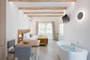 A beautifully designed and cozy single room featuring a jetted bathtub and a charming view of the village of Agia Marina. The room is equipped with a shower, air conditioning, and a luxurious king-size bed for a comfortable and relaxing stay.